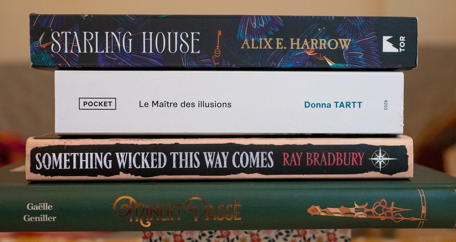 J’aime en savoir le moins possible sur une histoire avant de la commencer, mais si je devais attribuer des mots-clés qui m’ont faits choisir ces quatre livres je dirais : Halloween, étrange et fête foraine ; manoir et secret ; dark academia ; magie et mystère.